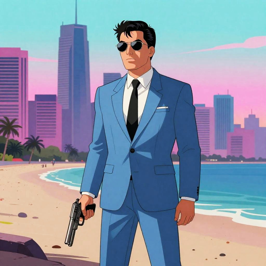 A retro 1990s video game style illustration of a man holding a submachine gun standing near a beachfront with a city skyline in the background, bold outlines and vibrant colors, neon pink and blue sunset gradient sky, stylized synthwave aesthetic, 90s action game cover art style