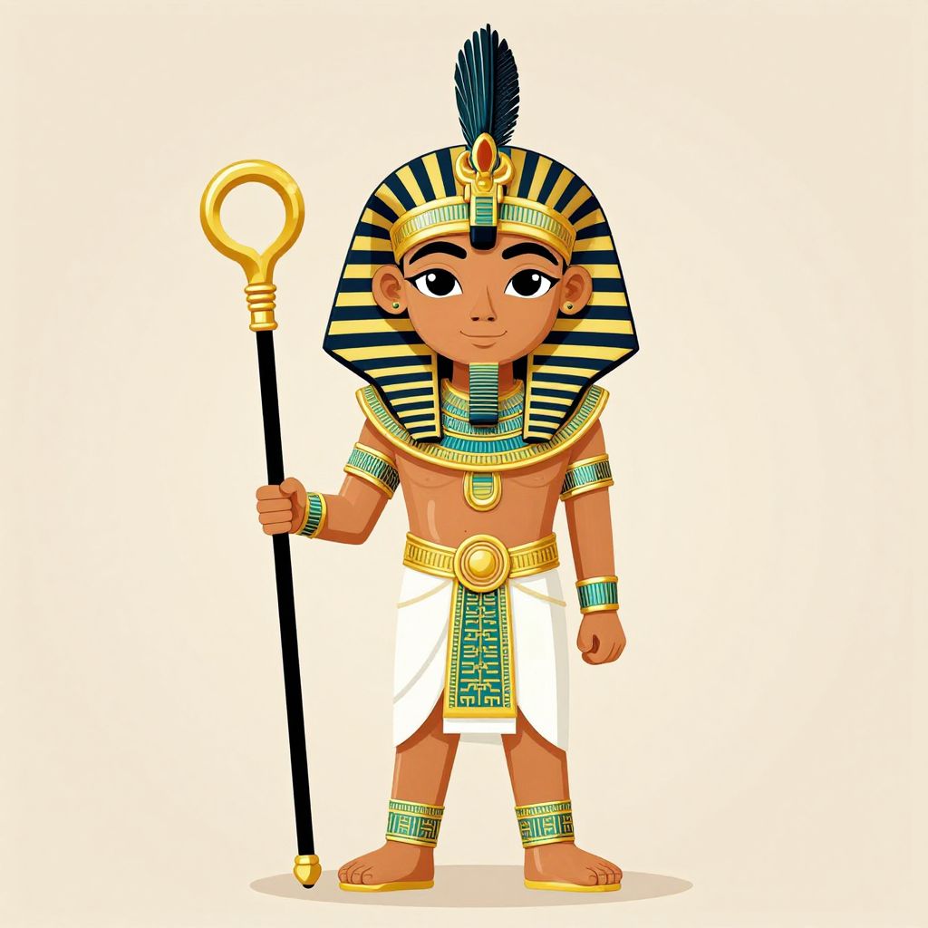 Cartoon Egyptian pharaoh child with dark skin, striped black-and-gold headdress, white loincloth, gold jewelry, holding black staff with