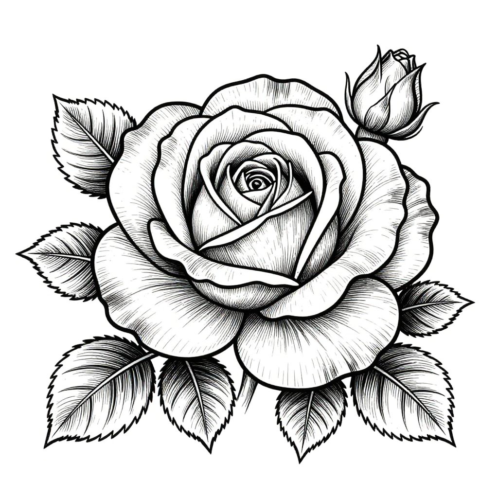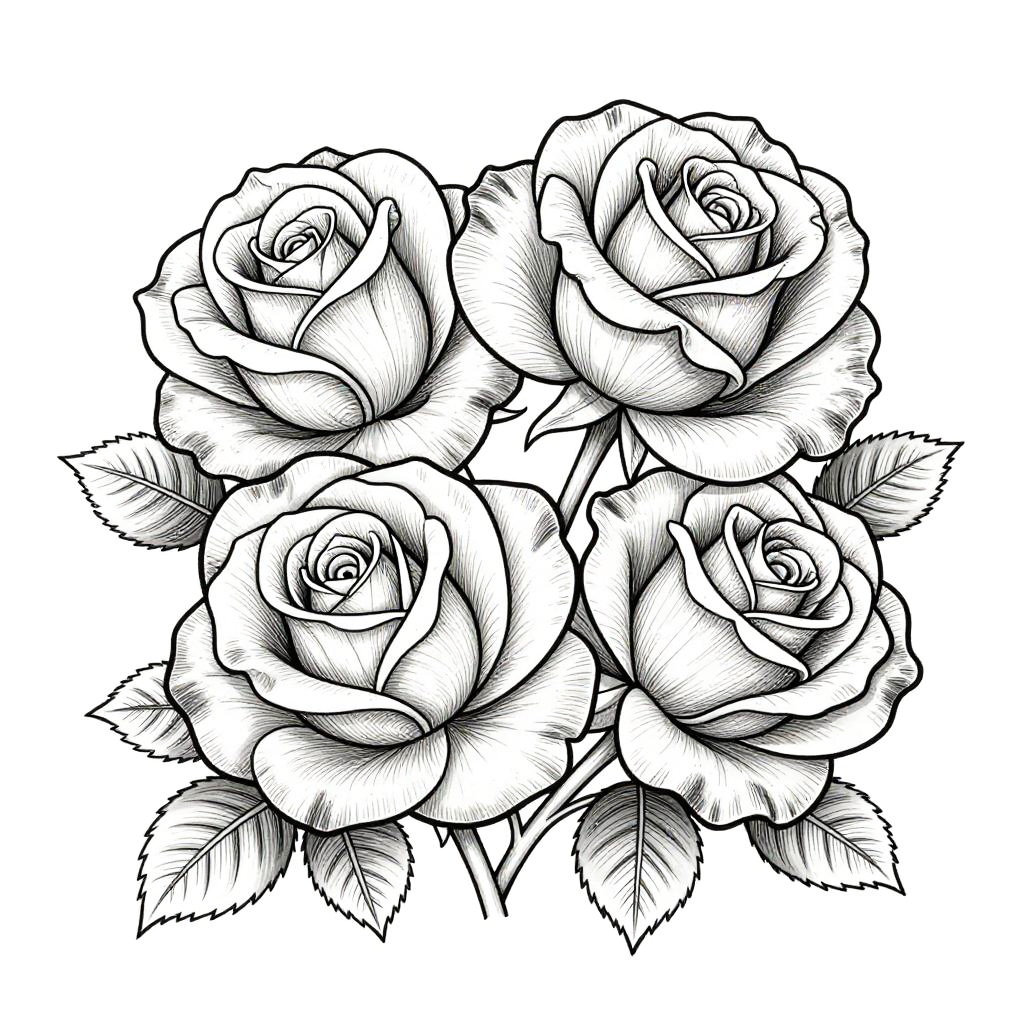 Realistic rose coloring pages with high-resolution outlines of blooming roses, capturing delicate veins on petals and subtle gradients, designed for therapeutic coloring sessions, set against minimalistic backgrounds to emphasize floral elegance.