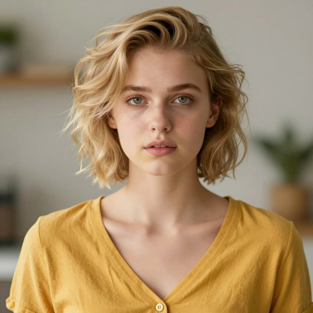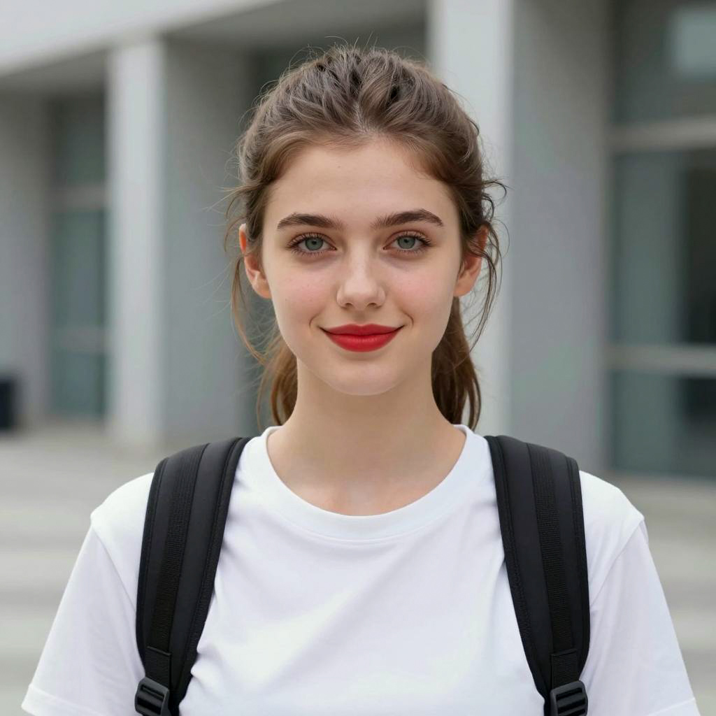 Travel wear costume, photorealistic portrait of young woman, front view, center focus, daytime outdoor setting, blonde hair in bun, beige headband, green blue eyes, white long-sleeve shirt, rainbow striped scarf, brown shoulder bag strap, soft natural light, blurred background with people and trees, warm color palette, clear sky, detailed ures, casual attire, slightly serious expression, realistic style, high detail, daytime photography, summer vibe, young adult, Caucasian ethnicity