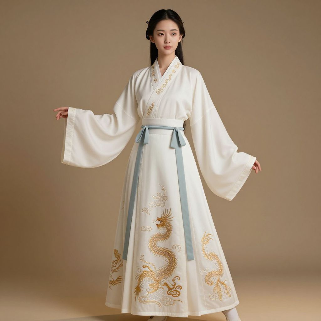 AI-generated Chinese dress featuring classic hanfu elements, delicate embroidery of dragons and phoenixes, modern fusion with minimalist lines, warm ambient lighting, elegant posture of a young woman, digital art with photorealistic depth and color accuracy.