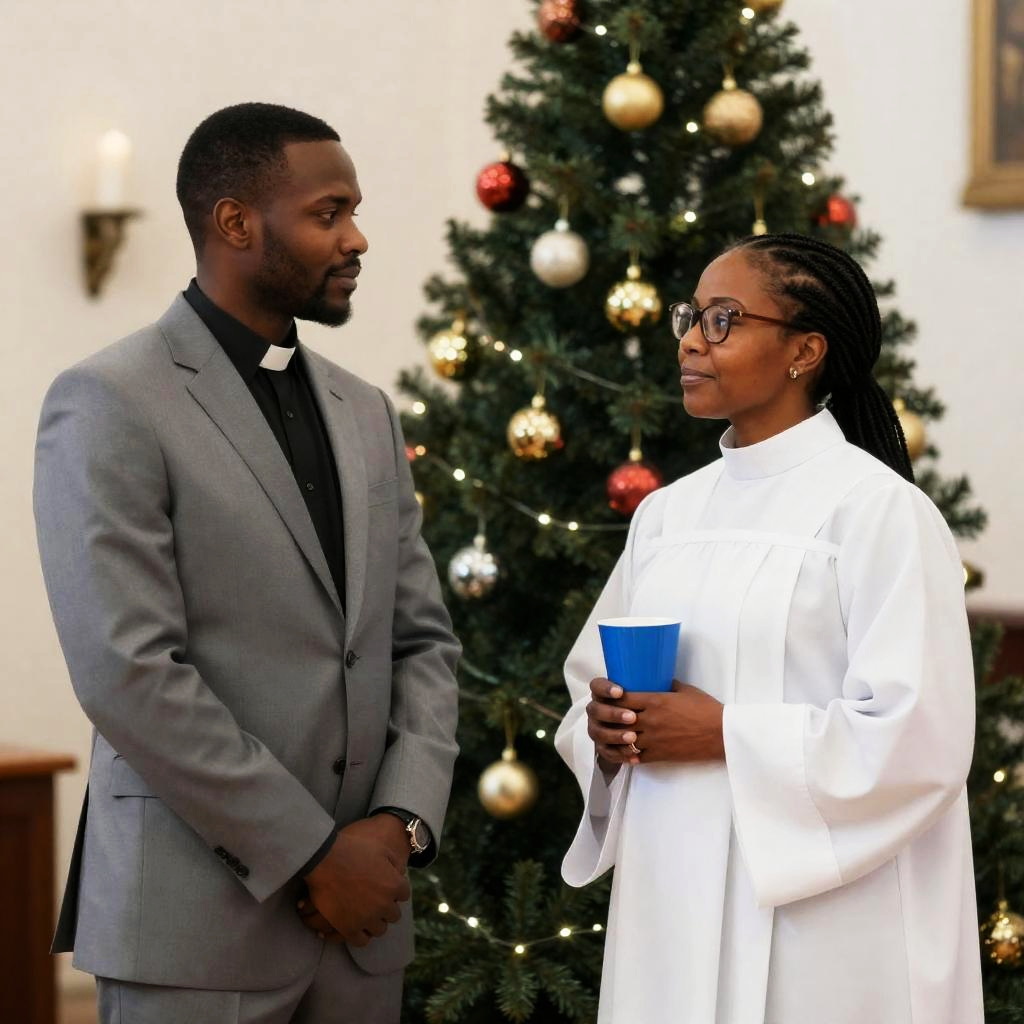 Black male clergy member in a gray suit with a black clerical collar and a Black female clergy member in a white liturgical robe holding a blue cup, standing face to face inside a church. A decorated Christmas tree with gold, red, and silver ornaments and string lights is visible in the background, along with a lit candle on the wall. The woman has braided hair and wears glasses.
