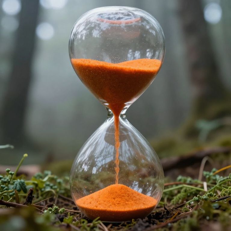 Photograph of a glass hourglass with orange sand, set on mossy forest floor, blurred forest background, natural light, serene mood.