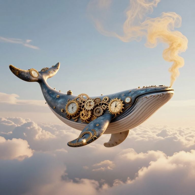 Clockwork whale glides serenely through the ethereal sky, its ornate body adorned with intricate clocks and gears, while a plume of golden smoke billows from its blowhole, illuminating the soft clouds below.