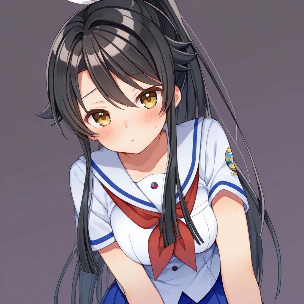 This is a digital anime-style drawing of a young woman with long, black hair tied in a high ponytail with loose strands framing her face. She has large, amber-colored eyes and a blushing expression. She wears a white sailor uniform with blue trim, a red neckerchief, and a blue skirt. The background is a solid, dark purple. Her posture is slightly leaning forward, with a shy and somewhat bashful demeanor. The artwork is vivid with bright colors and sharp lines, typical of contemporary anime aesthetics.