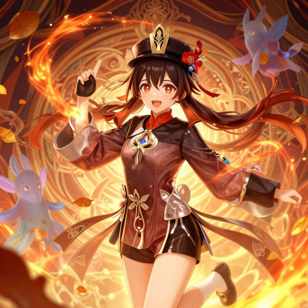 Hu Tao images depicting a lively young woman in traditional Chinese attire, surrounded by autumn leaves and mystical spirits, with a vibrant fiery color palette and intricate background details, in a dynamic anime-inspired art style.