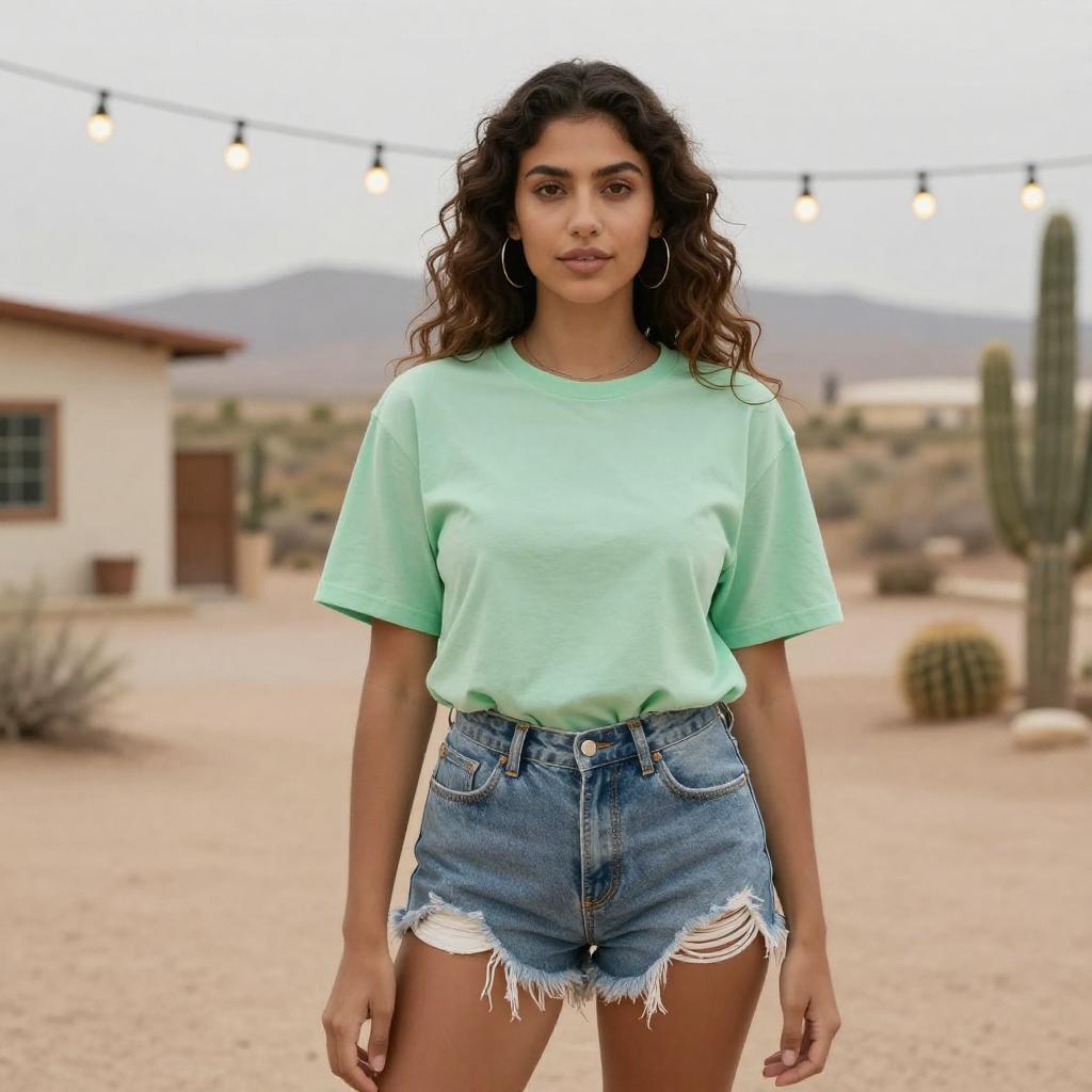 Photograph of a young woman with curly dark brown hair, wearing a light green short-sleeve t-shirt and high-waisted, frayed denim shorts. She stands in a desert setting with string lights in the background, a beige house with a brown door on the left, and cacti and dry bushes scattered around. Her skin tone is medium, and she has hoop earrings. The desert landscape includes distant mountains under an overcast sky. The overall style is casual and relaxed, with a focus on natural, outdoor beauty.