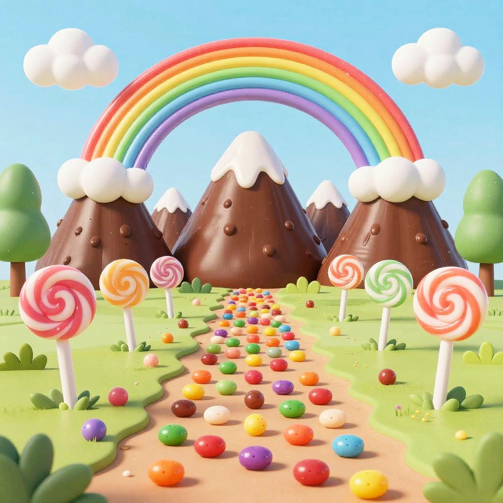 Candy landscape with rolling hills made of colorful gummy sweets, lollipop trees swaying under a cotton candy sky, a caramel river flowing gently, and sparkling sugar crystals scattered across the scene, vibrant and whimsical, fantasy art style.