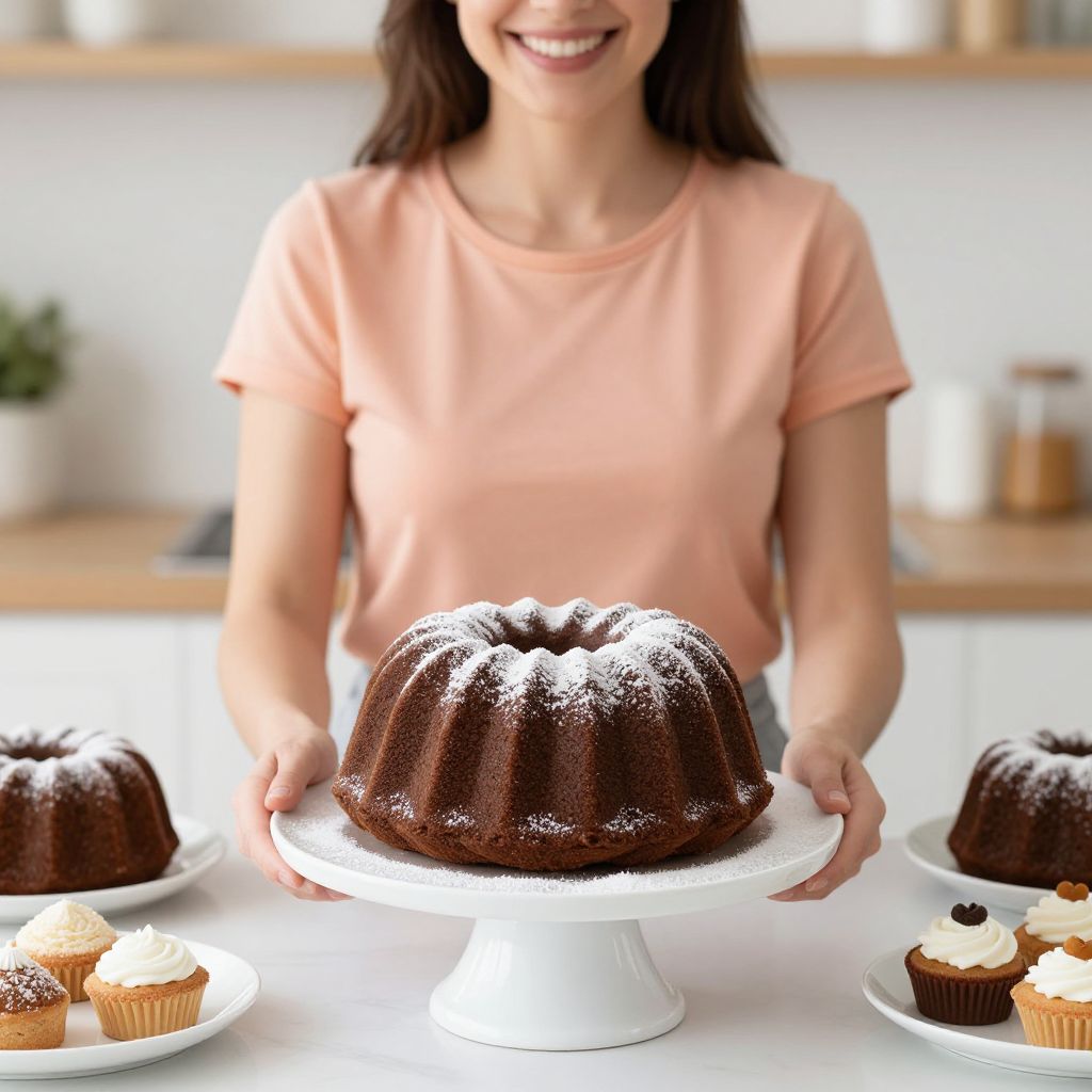 Photograph of a smiling woman with long brown hair, wearing a peach long-sleeve shirt, holding a chocolate bundt cake dusted with powdered sugar on a white stand. The background is a bright kitchen with blurred white shelves and a silver kettle. The table displays additional chocolate bundt cakes, cupcake with white frosting, and chocolate truffles. The image has a warm, inviting feel with soft lighting and a focus on the rich textures of the desserts.
