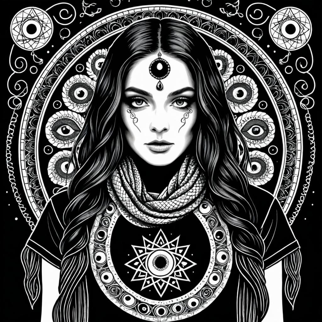 Overhead t-shirt design featuring a serpent goddess with snake eyes and long hair. Styled in occult, featuring eyestones, flowing scarves, and mandala patterns with black-and-white vector illustration on a black background.