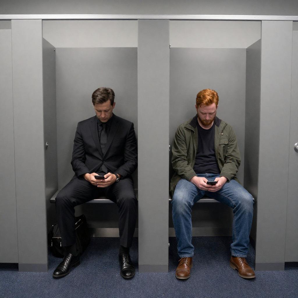 Photograph of two men in a metal-enclosed public restroom stall. Man on left, dark-haired, black suit, holding phone, black bag beside him. Man on right, red-haired, green jacket, blue jeans, holding phone, brown shoes on floor. Blue carpeted floor, metal stall dividers. Both men with neutral expressions, sitting on benches.