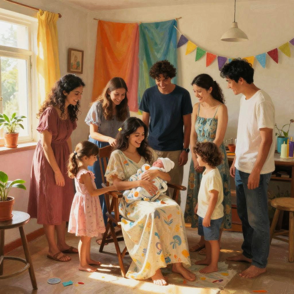 A vibrant indoor Geburt scene with colorful decorations, family and friends surrounding a mother giving birth, joyful expressions, flowing fabrics, natural materials, warm sunset light, inclusive and supportive environment, expressive brush strokes
