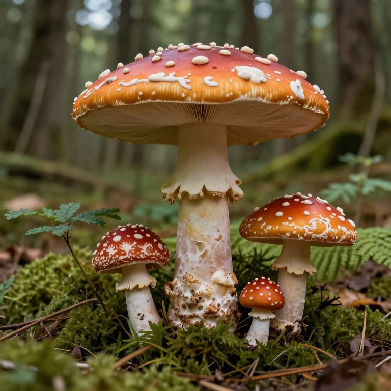 A close up image of an amanita mushroom found deep in a fantastical redwood forest, The mushroom grows among piles of old decaying trees that have fallen and smooth rocks covered in soft moss, It's stalk is a creamy white with visible lines showing its fibrous texture, The cap is a vibrant red color with circular patches of a pure white color and rough texture, Everything is still wet from a recent rainfall and the moss on the trees and forest floor is a bright vibrant green, The little sunlight that penetrated the forest canopy is diffused by a dense fog throught the forest, The mood is still and quiet, It's tranquil here, flrlizer