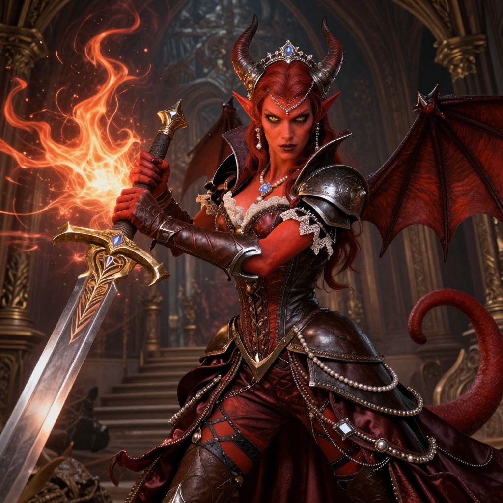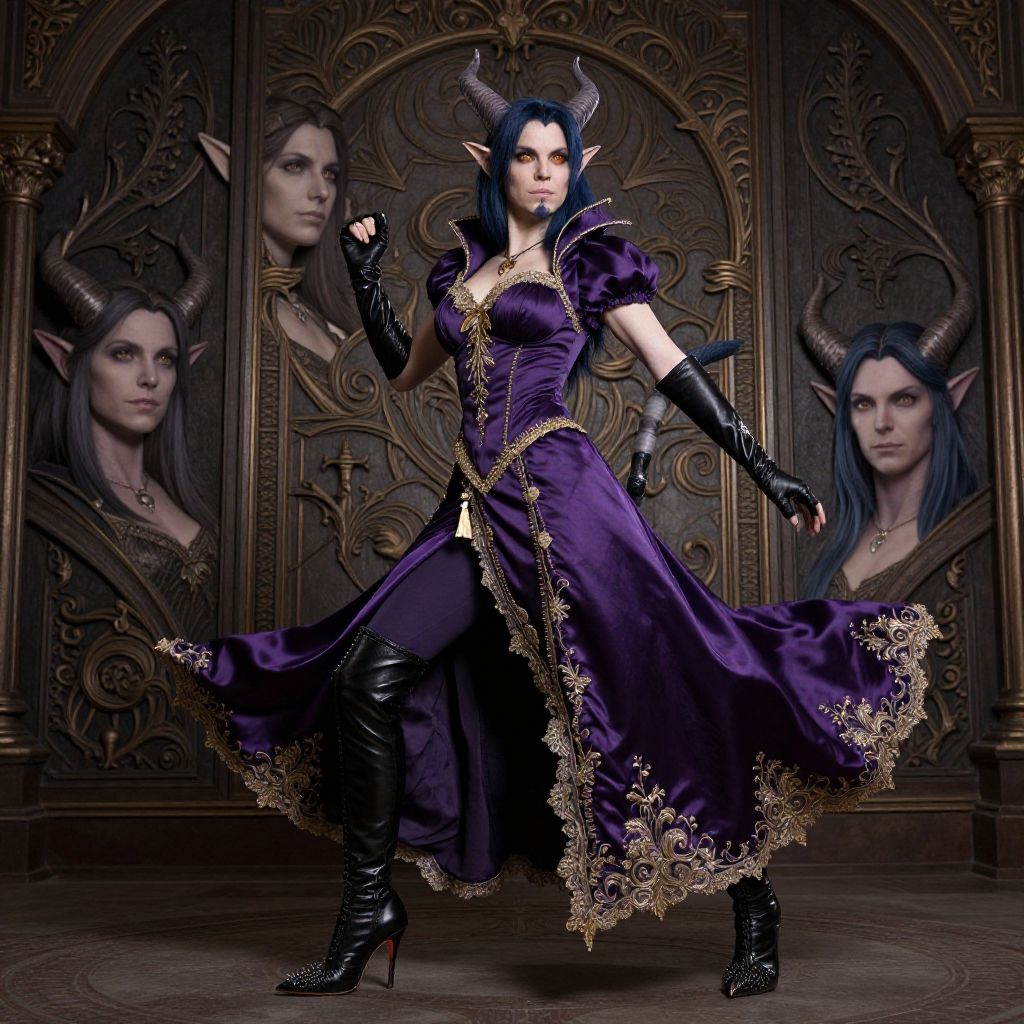 (score_9, score_8_up:1.1), score_7_ up, highly detailed, realistic, photorealistic, zPDXL, ((1 girl)) slender, petite, Tiefling man, midnight blue hair, neatly trimmed goatee, horns, tail, commanding presence, middle-aged, fiery orange eyes she wear Purple satin gown with gold embroidery and lace detailing, black leather gloves, matching high-heeled boots with spiky heels (Sorceress), dynamic pose, detialed background, masterpeice, detailed, intricated details, 8k, ultraclear, wide angle, detailed scene, detailed faces, perfect quality, tranding on artstation, incredible details, Painstaking Attention To Details