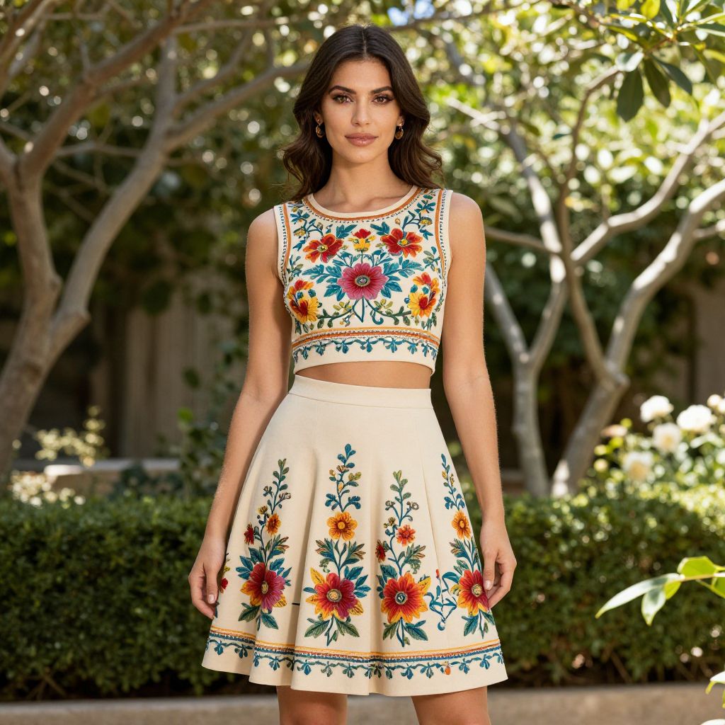 Photograph of a woman in a sleeveless white crop top and skirt with colorful floral embroidery, standing outdoors in a sunny garden.