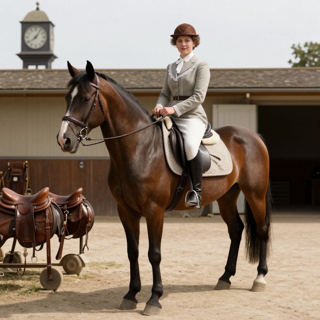 An aristocratic 1930s equestrian lady with fair skin, a strong jawline, and a subtle smile, wearing elegant riding boots and a fitted riding dress with lace trim, seated on a well-groomed Andalusian horse in a sunlit stable yard, the setting includes vintage horse gear, leather saddles, and a clock tower in the background, realistic period-accurate photograph