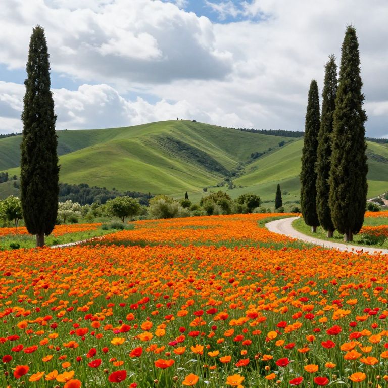 Photograph of a vibrant landscape featuring a vast field of bright orange and red poppies in full bloom. Four tall, slender cypress trees stand in a line on the right, leading to a winding gravel path that curves through the field. In the background, rolling green hills rise under a partly cloudy sky with white and gray clouds. The poppies cover the entire foreground, creating a rich, colorful carpet. The cypress trees and path add vertical and linear elements, contrasting with the field's horizontal spread. The overall scene exudes a sense of natural beauty and tranquility.