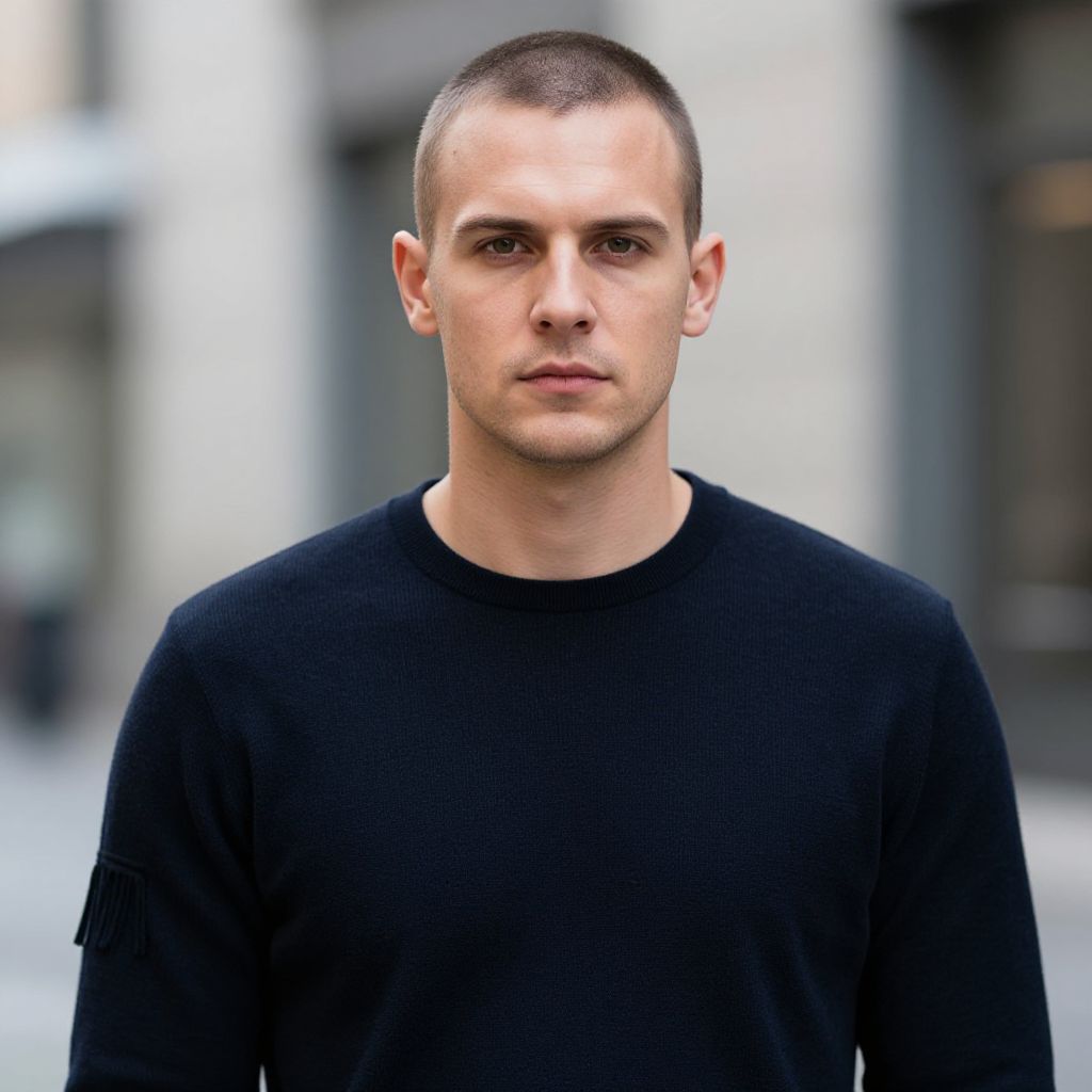 A fit European man with short natural hair, in a minimalist indoor setting, realistic portrait, focusing on the texture of his hair and his composed, approachable demeanor