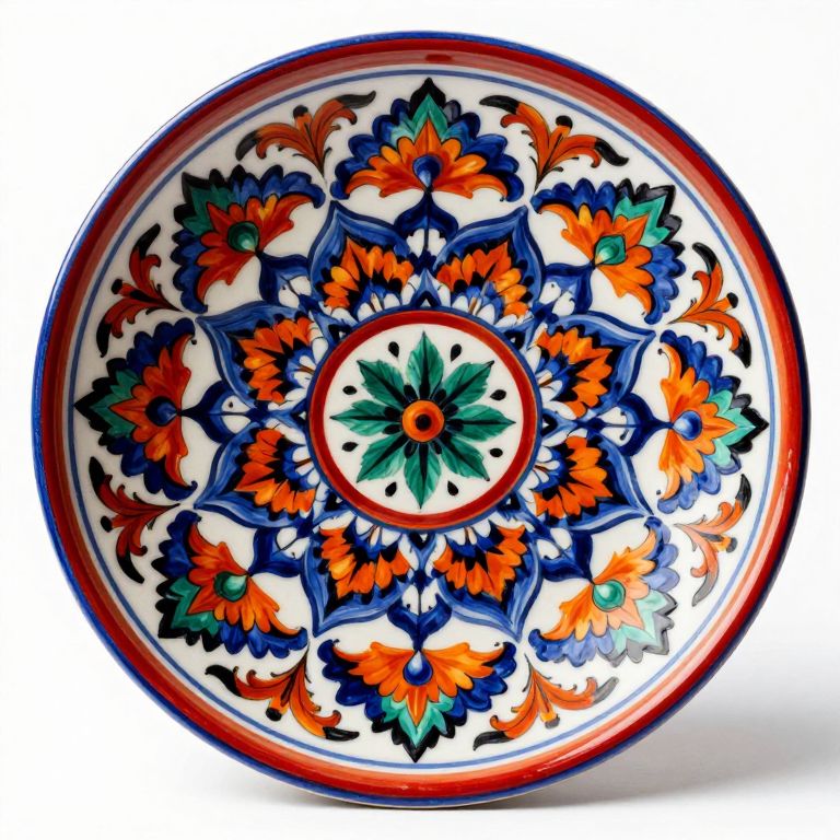 A hand-painted Turkish ceramic plate showcases intricate mandala-inspired designs with vibrant floral motifs in orange, blue, green, and black, set against a white background with bold red and blue borders, exemplifying traditional craftsmanship and ornate symmetry.