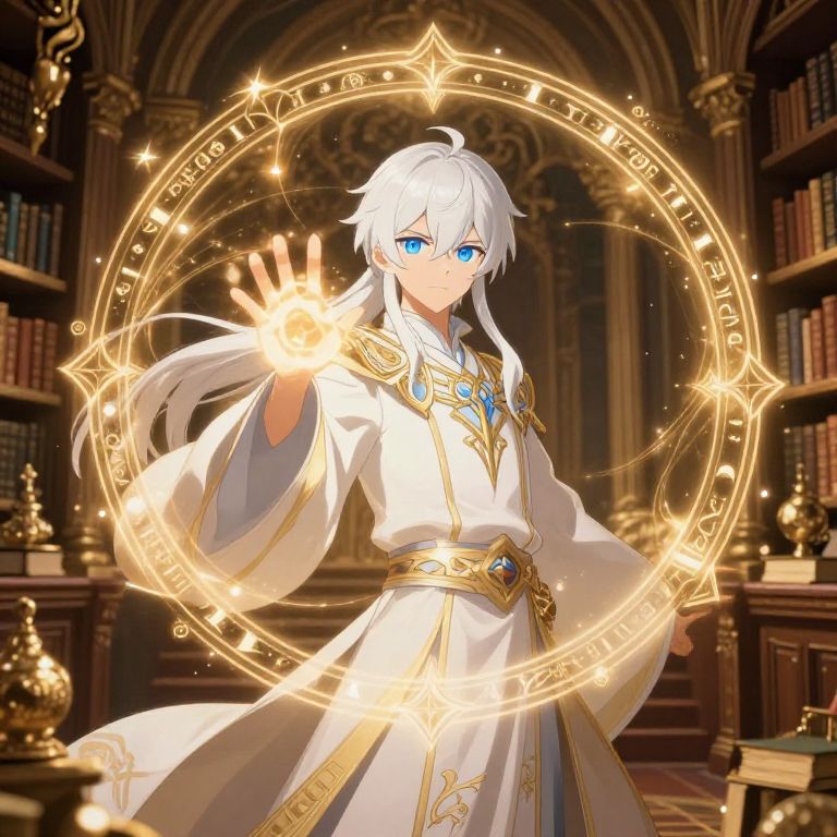 White hair blue eyes anime mage casting a powerful spell in an ancient library, swirling magical runes around them, elaborate robes with intricate designs, warm golden lighting contrasting with cool blue eyes, richly detailed environment filled with books and artifacts.