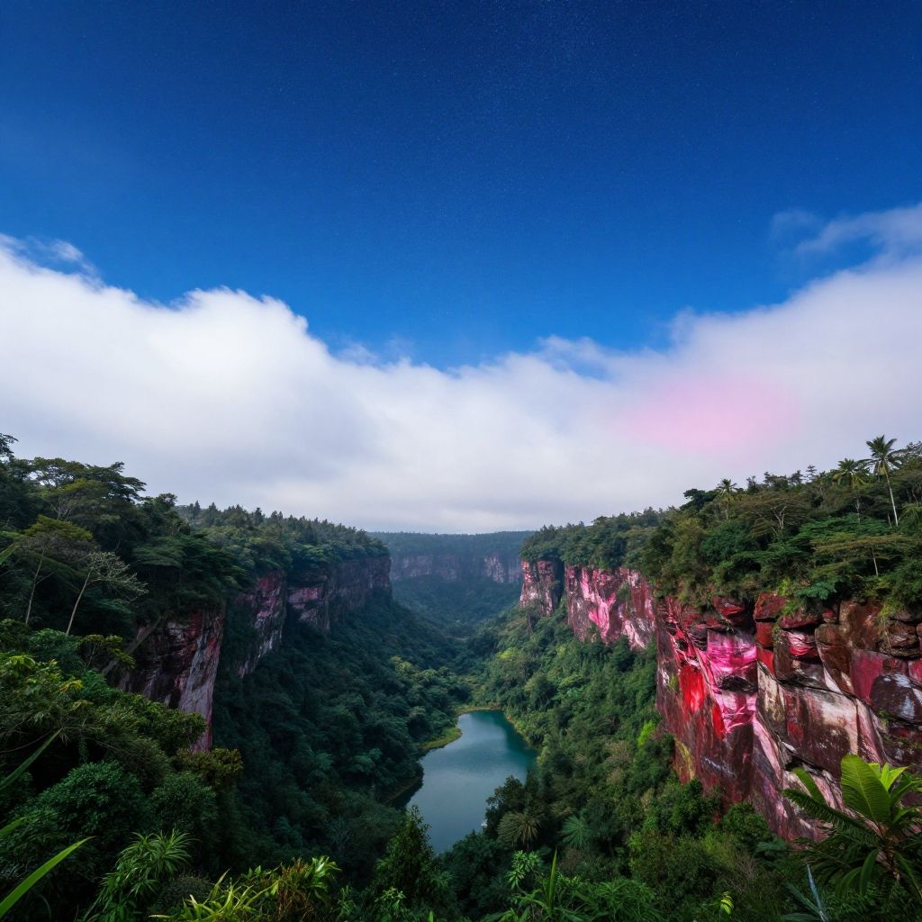 Random perspective, f/4.5, <8k, high detail, uhd, sharp focus, palette, photorealistic, absurdres, extreme detail, as much detail as possible, extremely high visibility>, bright azure, bright white, matte indigo, shiny pink, muted red, (a mesmerizing scenery of clouds and stars showing a natural landscape:1.3), celestial objects in a beautiful sky, pond, deep forest, cliff, taiga, ravine, gorge, jungle, trees, nature, mountains, noon, (rain:0.5), the most beautiful image in the world