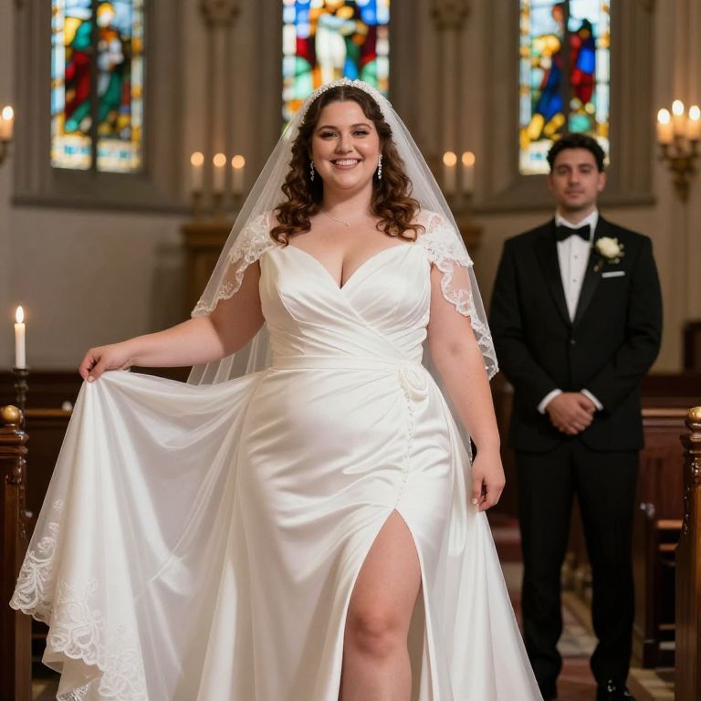 Photograph of a plus-size bride with fair skin and curly brown hair, wearing a white satin wedding dress with a deep V-neck and lace trim, accompanied by a sheer veil. She smiles confidently, holding up the side of her dress to reveal a high slit. In the background, a groom with short dark hair in a black tuxedo and white rose boutonniere stands beside a wooden altar with lit candles. The church interior features stained glass windows with colorful designs and soft, warm lighting. The bride's dress has a smooth, shiny texture, contrasting with the groom's formal, matte attire.