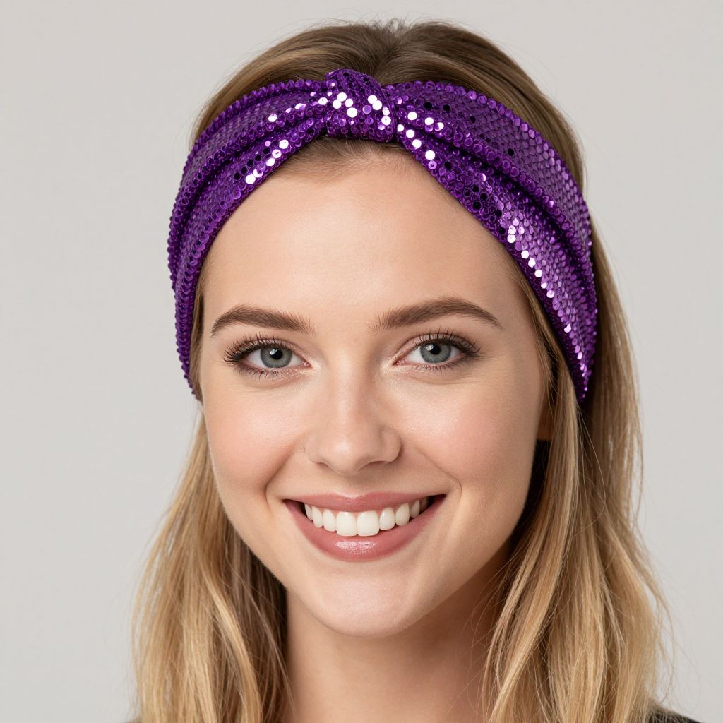 Woman wearing a vibrant purple sequined headband smiles brightly against a plain background, showcasing the sparkling accessory that complements her blonde hair.