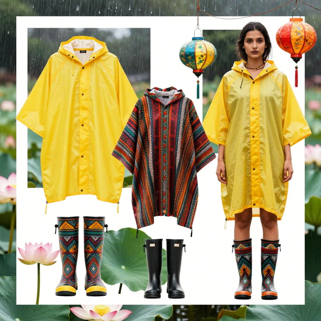 Stylish moodboard collage with a monsoon festival fashion, featuring bright waterproof ponchos and rubber boots with ethnic prints. The background includes raindrops, lotus flowers, and festive lanterns to add a natural touch. The color palette is bold and colorful, with a high-fashion editorial style. Layered images create a cohesive and visually captivating moodboard, blending vibrant colors with carefully curated fashion elements for an inspiring, trend-focused design.