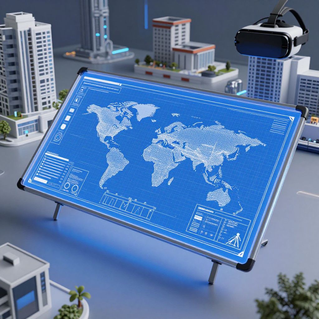 Draw blueprints online free on a futuristic transparent touchscreen display, surrounded by virtual reality architectural models, blending realism and sci-fi aesthetics, highlighting advanced free blueprint design tools accessible from anywhere in the world.