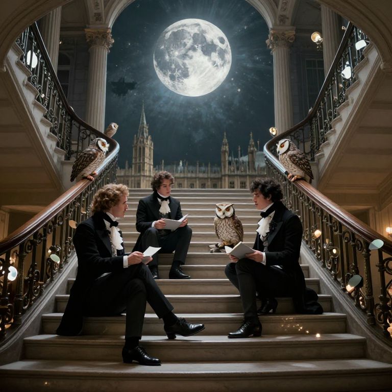Photograph-style digital illustration of four elegantly dressed individuals in black formal attire seated on grand, arched staircase steps at night. A full moon shines brightly in the dark sky above, illuminating a distant Gothic-style castle. Two large owls perch on the iron railings on either side of the staircase. The individuals, with varying hairstyles and genders, engage in conversation, holding papers. Soft, warm light bulbs are embedded in the railings, adding a subtle glow. The scene exudes a mysterious, Gothic ambiance with intricate architectural details and a magical, nighttime atmosphere.