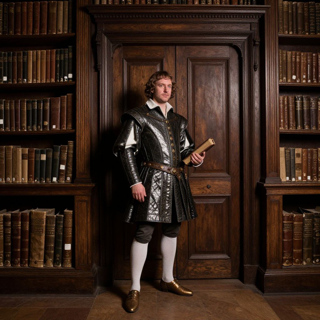 A man in a Renaissance doublet and hose, holding a book, posed in a dimly lit library with towering shelves and a grand wooden door.