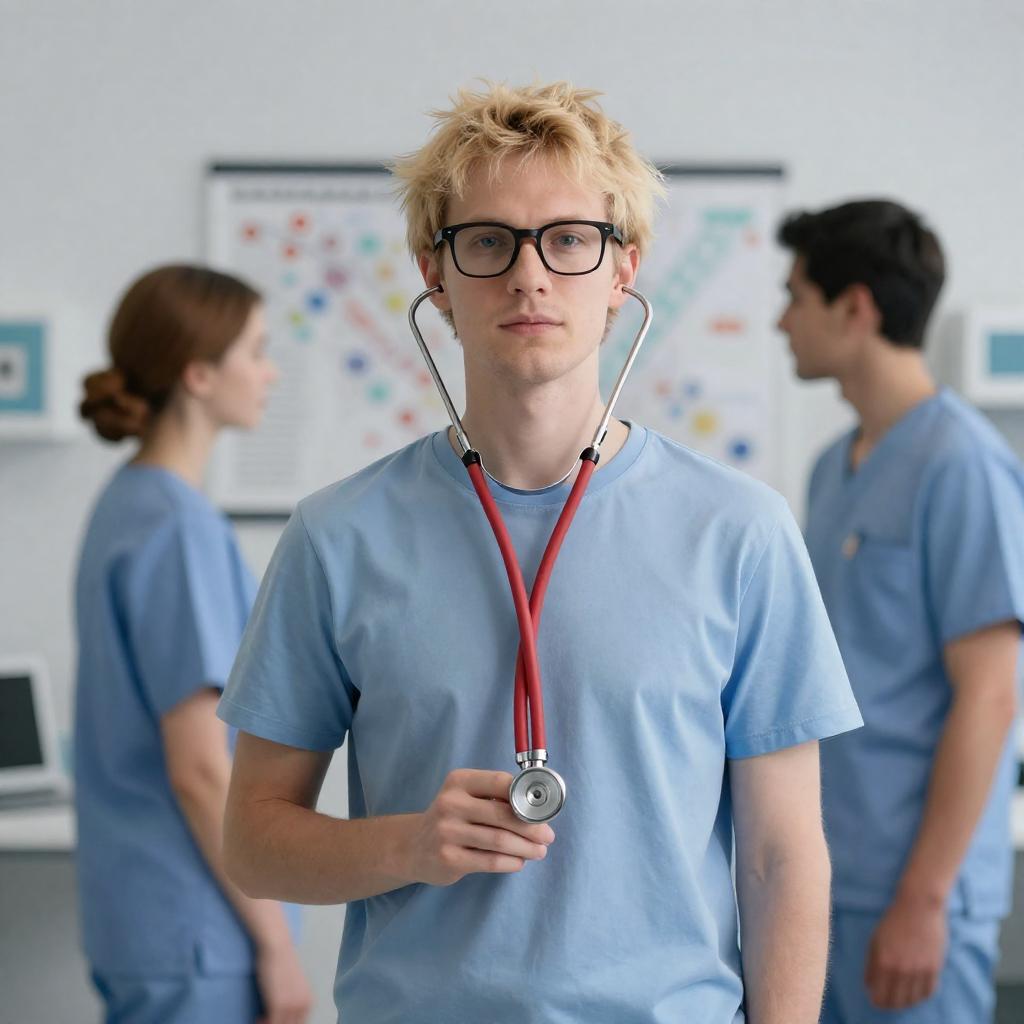 Blonde man with shaggy hair, black glasses, light blue T-shirt, holding red stethoscope, standing in medical office. Two people in background, one with short hair, one with dark hair, wearing light blue scrubs, facing wall map. Clinical setting.