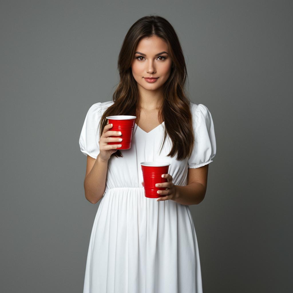 Beer pong costume, photograph of young woman, long brown wavy hair, white satin dress with red trim, holding red Coca-Cola cup in right hand, holding red apple in left hand, neutral grey background, realistic style, standing pose, soft lighting, slight smile, simple background, casual outfit, summer vibe, medium shot, modern fashion, minimalistic