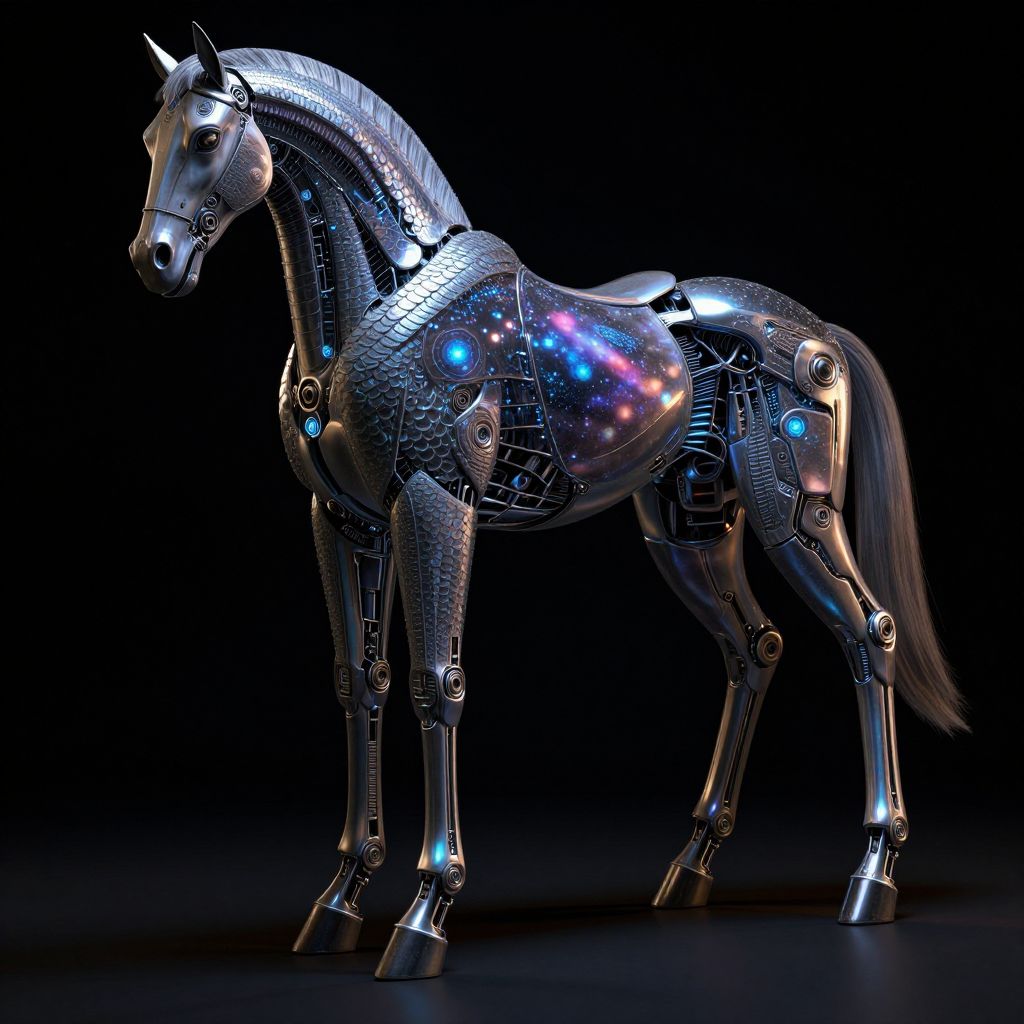 Photorealistic CGI of a metallic, robotic horse with glowing blue and purple lights, standing against a black background.