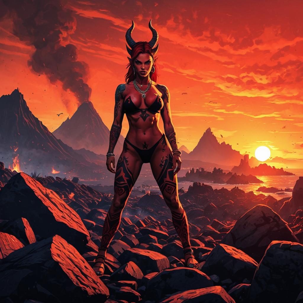 GTA V cover art style, red-skinned demon woman with horns and tribal tattoos standing on volcanic rocks, cartoon illustration, dramatic action pose, fiery sunset lighting, lava-filled background