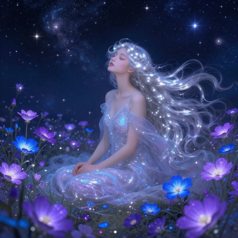 Digital art depicts a mystical scene of a cloaked figure in a dark, ornate robe with gold embroidery standing in a vibrant, colorful flower field at night. The figure gazes upward at a glowing dragonfly and a planet in the star-filled sky. The robe's hood casts a shadow over the figure's face, adding an air of mystery. The flowers, in hues of yellow, pink, purple, and orange, surround the figure, with tall grass and various plants adding texture. The background transitions from a dark blue sky to a distant horizon, blending natural and celestial elements.