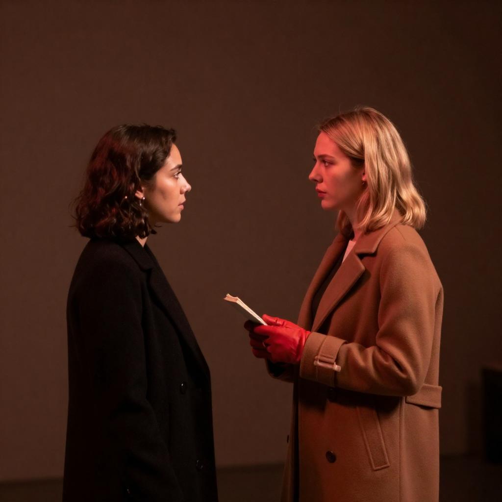Kneeling Woman Points at Seated Companion