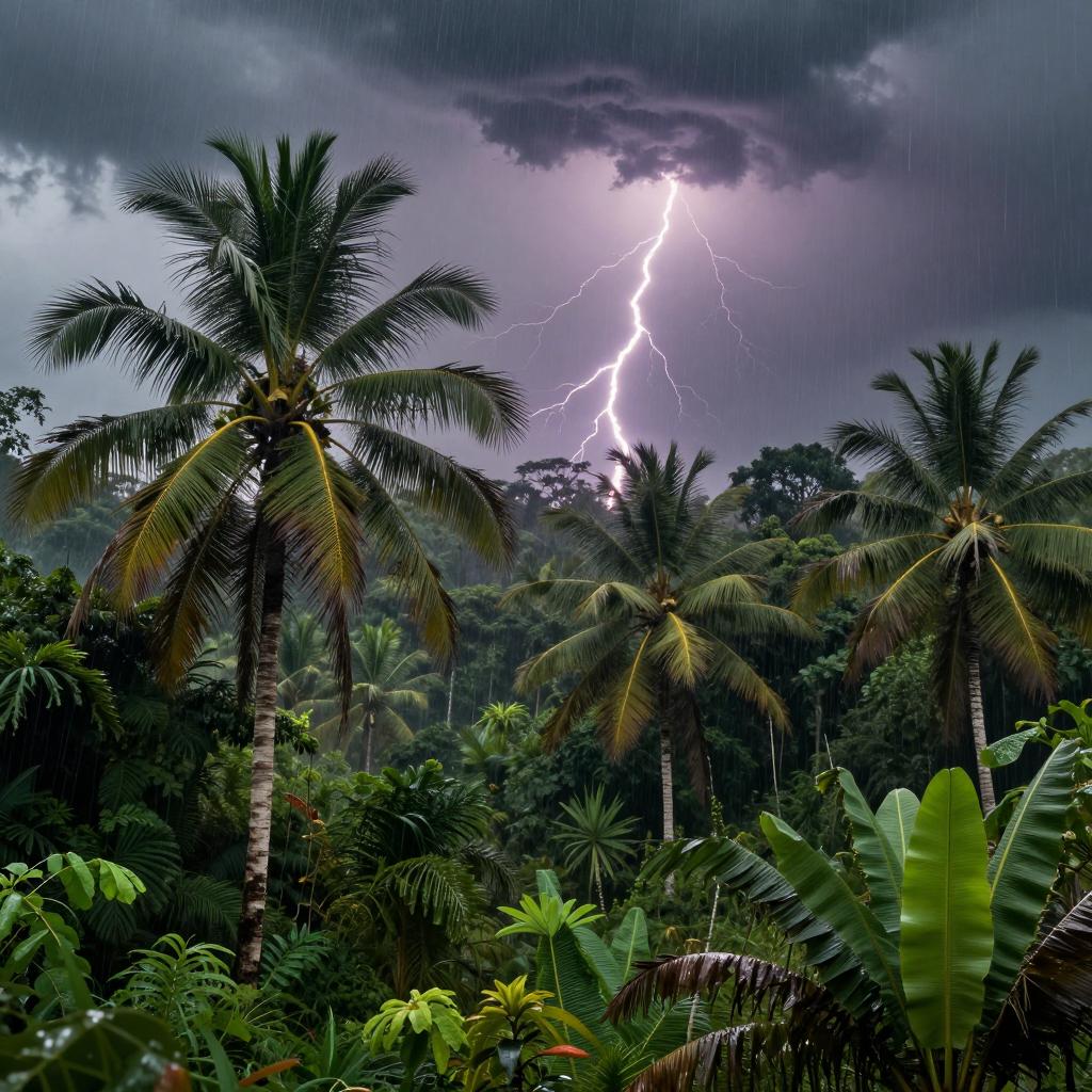 Hyper-realistic photo of a dense tropical rainforest during a powerful storm. Heavy rain pours down over lush green foliage, with tall palm trees prominently visible. Intense lightning bolt illuminates the dark stormy sky, highlighting the dramatic and intense natural atmosphere.