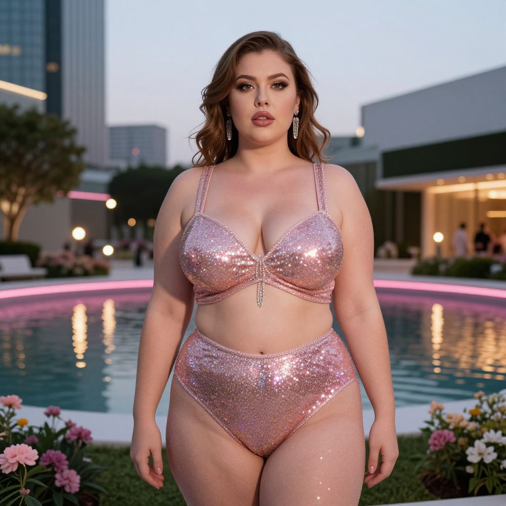 A strong, stylish plus-size woman with a determined look, full lips, and high cheekbones in a glittering plus-size sparkly evening costume, standing in a modern city garden at dusk, with soft pink and gold lights reflecting off the water and surrounding flowers, the costume catching the ambient evening glow.. The woman has big tits and cute face