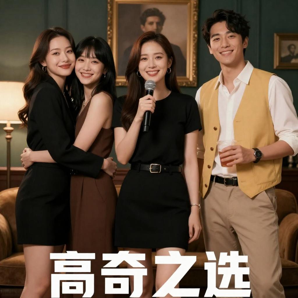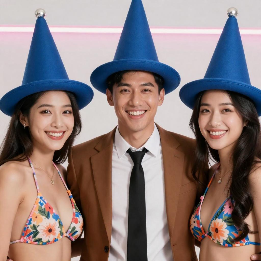 Photograph of three smiling women in blue, cone-shaped hats with silver balls, wearing floral bikini tops, and a man in a brown suit with a white shirt and black tie. Background has pink and white lights. Man stands in the center, women on either side. All have intense, joyful expressions.