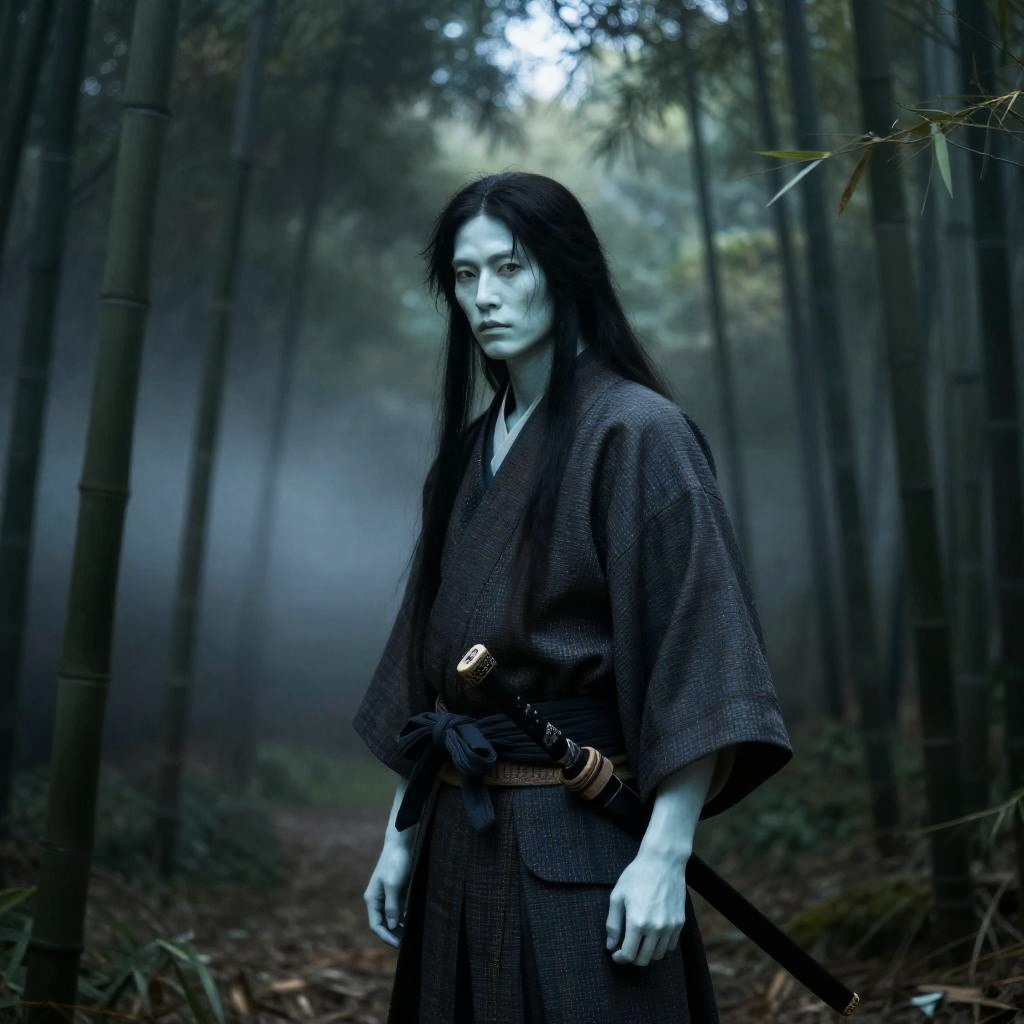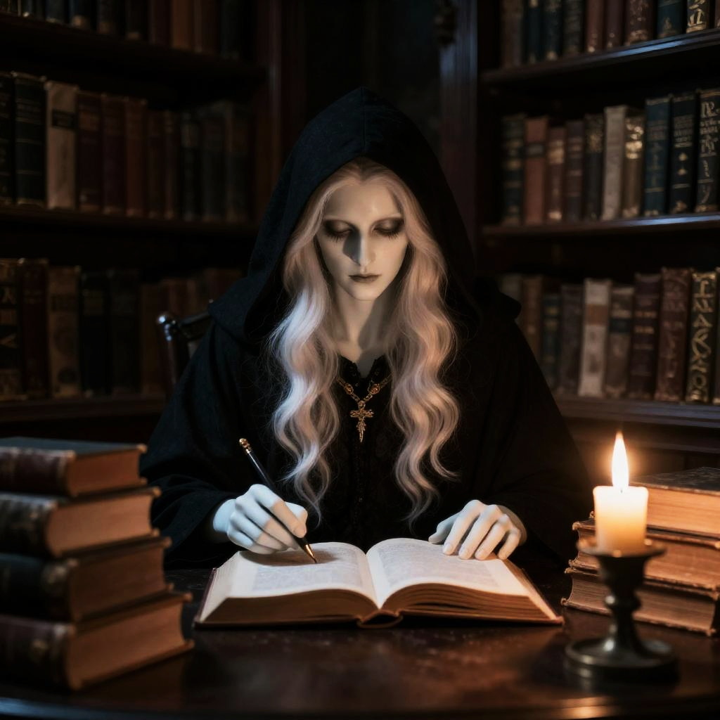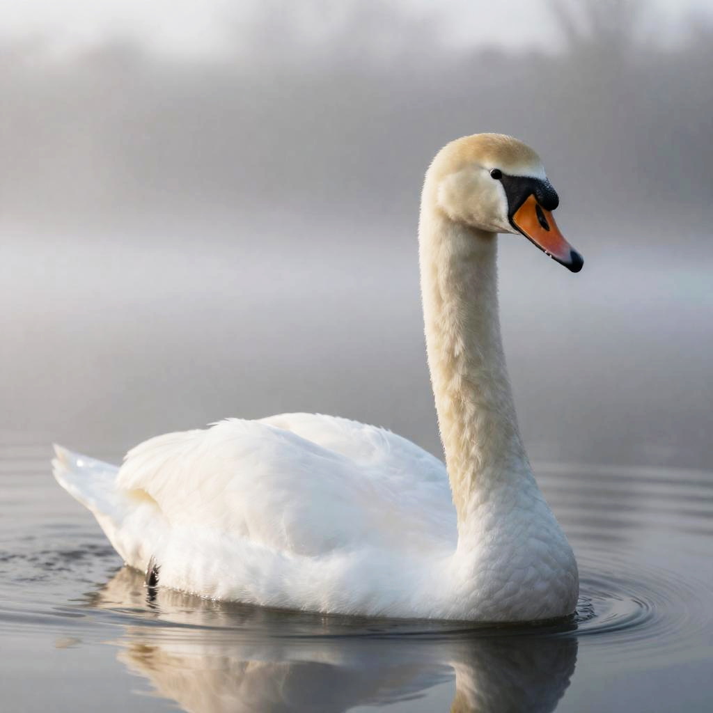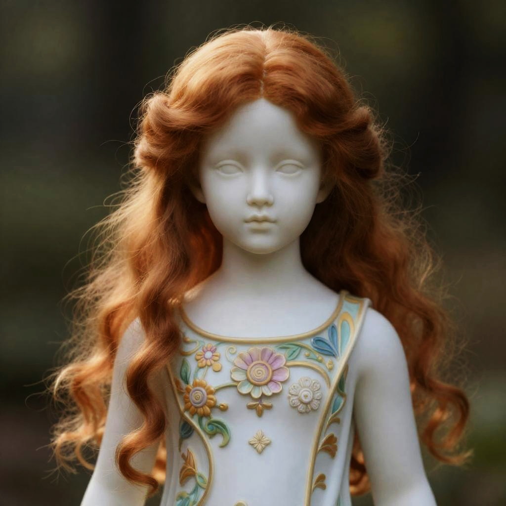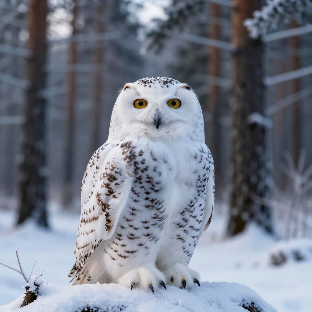 Long-Exposure photograph of a tranquil snowy owl with porcelain skin and long hair, inspired by Ivan Shishkin, featuring a frosted pine forest and crisp early morning light