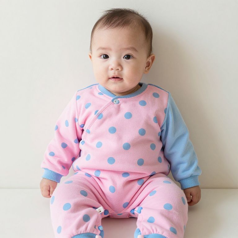 A baby is wearing a pink and blue outfit with a polka dot pattern.