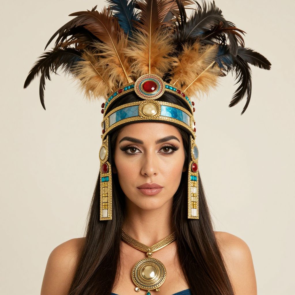 Aztec goddess halloween costume, a close up of a woman wearing a headdress and feathers
