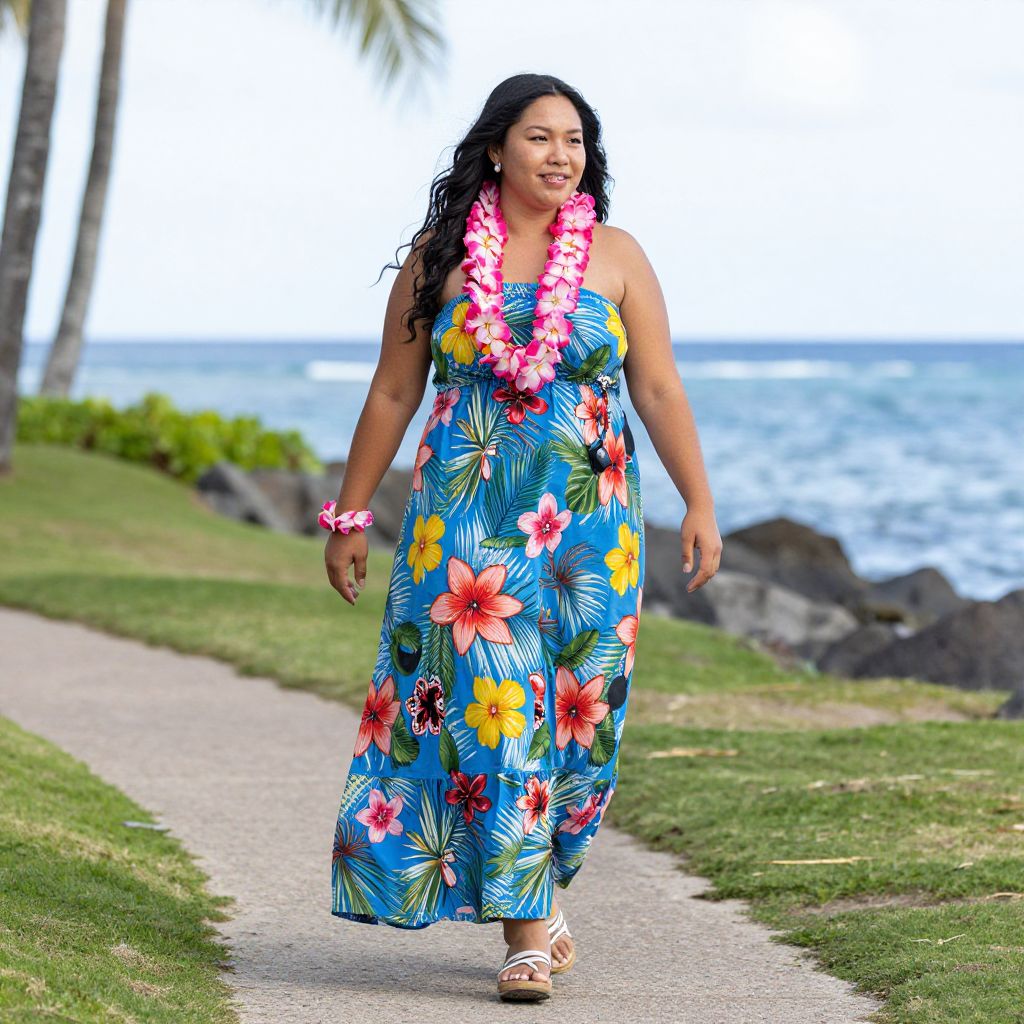 Hawaiian Costume Girl Plus Size, woman in a colorful dress walking on a sidewalk near the ocean