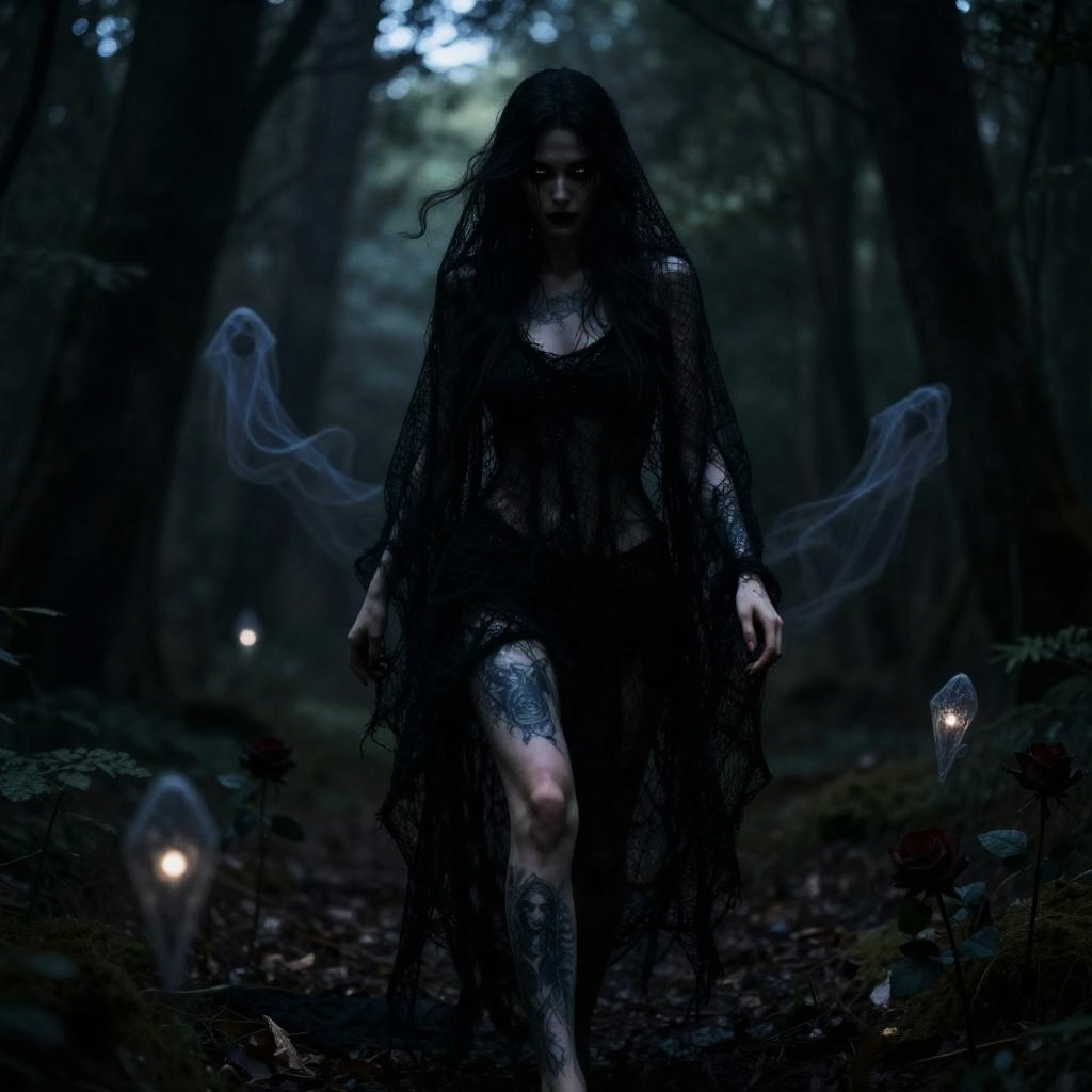 Divine spirit with obsidian black hair, walking gracefully, every step mesmerizing, flaming amber eyes, glowing cream skin, a vision of divine beauty and supernatural grace, ethereal and captivating.