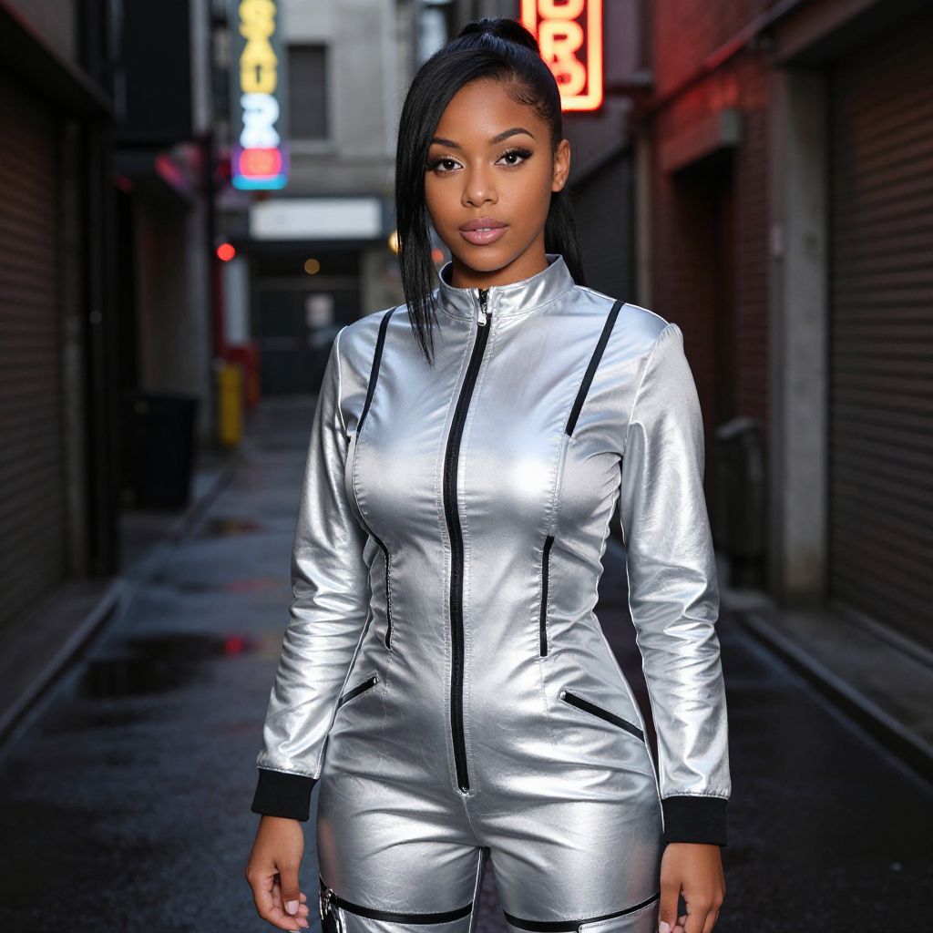 Photograph of a confident Black woman with sleek black hair, wearing a shiny silver zip-up jumpsuit, standing in a dimly lit urban alley with