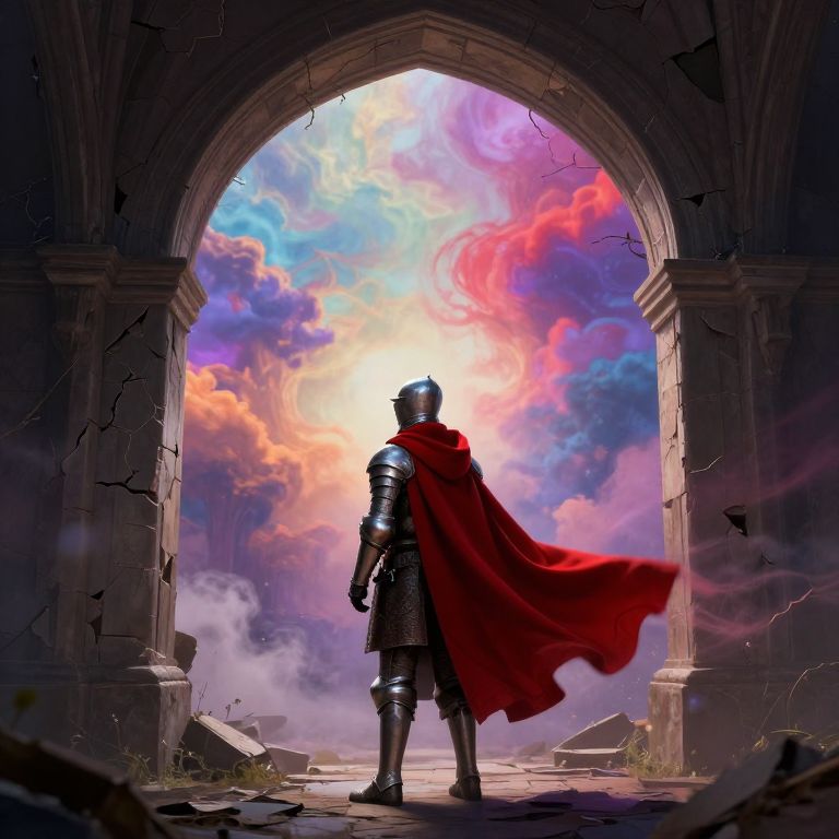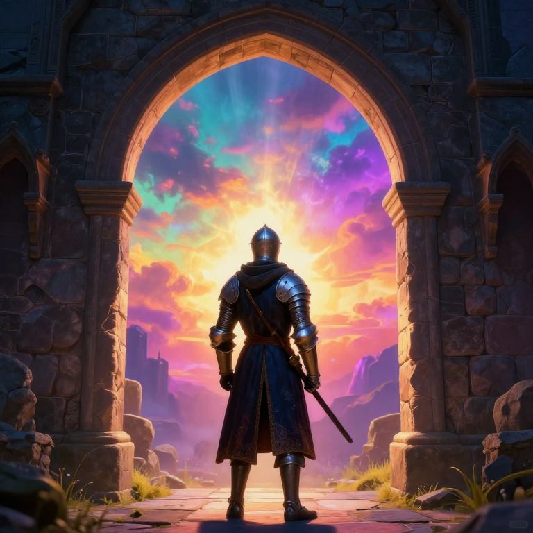 Medieval knight stands beneath a vibrant archway, gazing into a surreal sky awash with chromatic hues, as a radiant portal of light beckons beyond the ancient stone threshold.