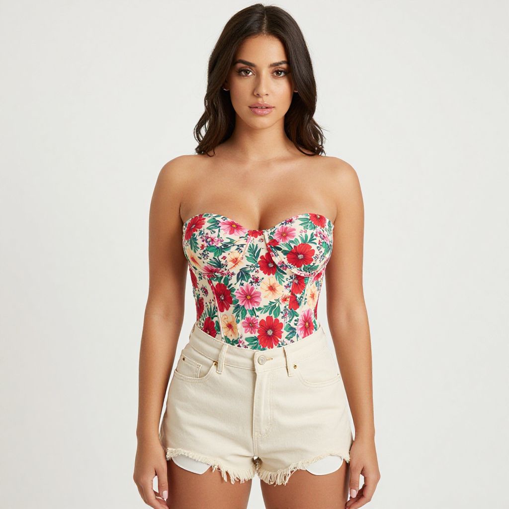 "Woman, casual summer, strapless floral corset-style top with a mix of red, pink, and green flowers on a light background, fitted silhouette, beige high-waisted denim shorts with frayed hems, white background.. Sexy. Pretty face and beаutiful eyes. Big breasts."