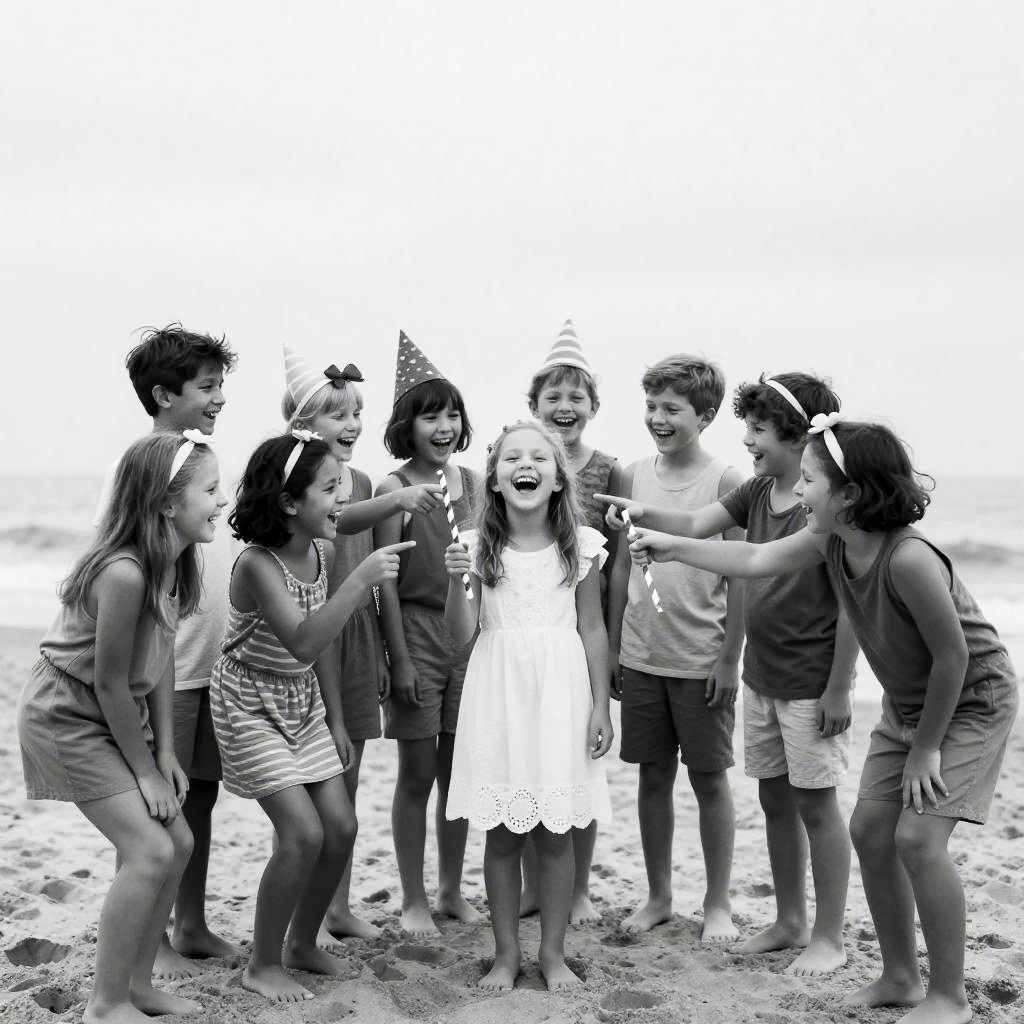 Black and white photograph of a group of children with striped wands, laughing and pointing at a laughing girl in the center. Children are wearing various costumes with hats and headbands. Sandy beach background. Eight children, one girl, intense laughter.