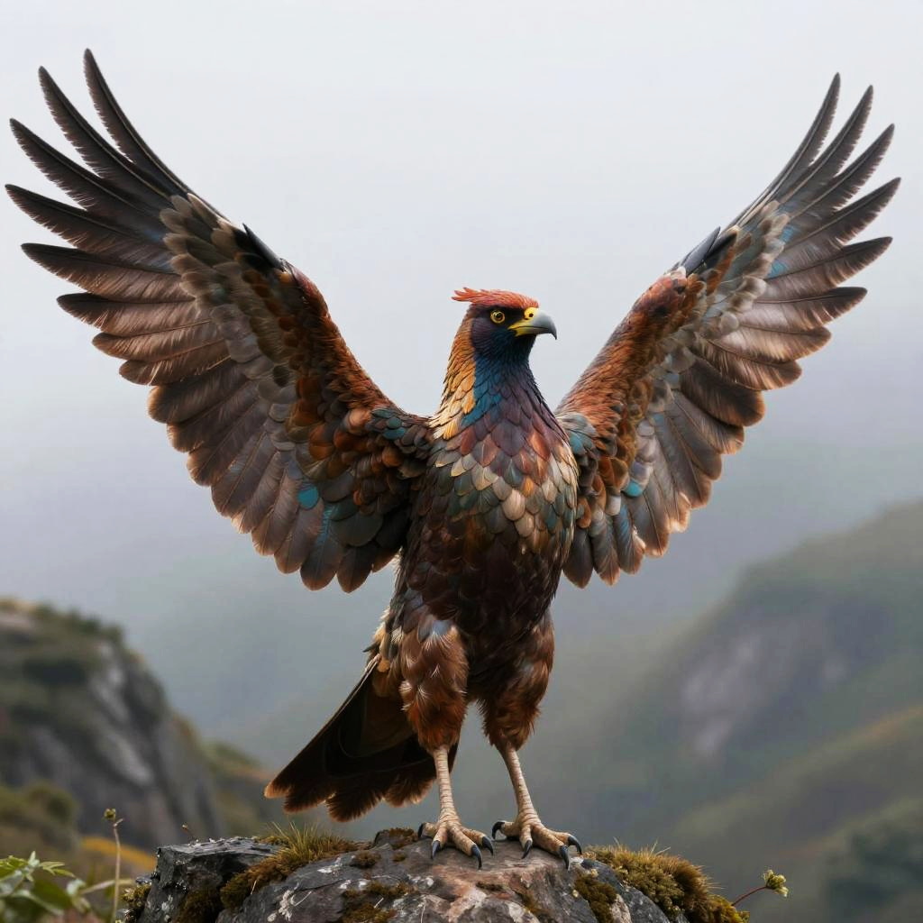 Photograph of a majestic, brown-feathered bird with outstretched wings standing on a rocky ledge against a misty mountain backdrop.